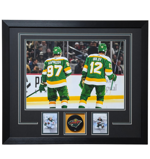 Kirill Kaprizov & Matt Boldy Professionally Framed Tribute Card & Puck Display Frame dimensions are 22x26 Already framed, ready to ship!
