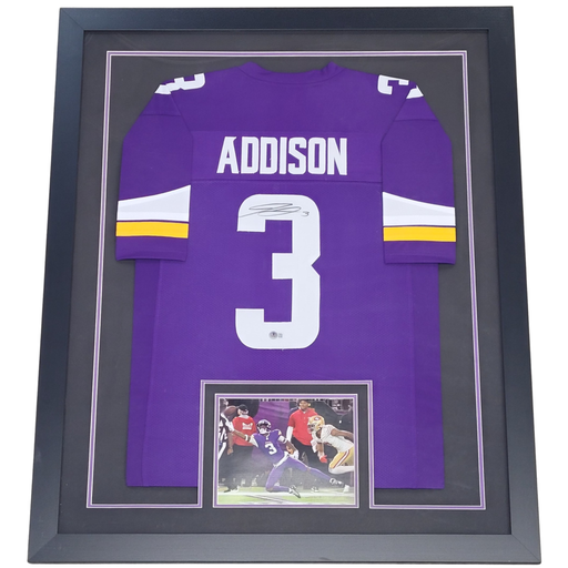 Jordan Addison Signed & Professionally Framed Player Purple Football Jersey * Photo May Vary* Approximate dimensions are 36x44 This jersey is m...