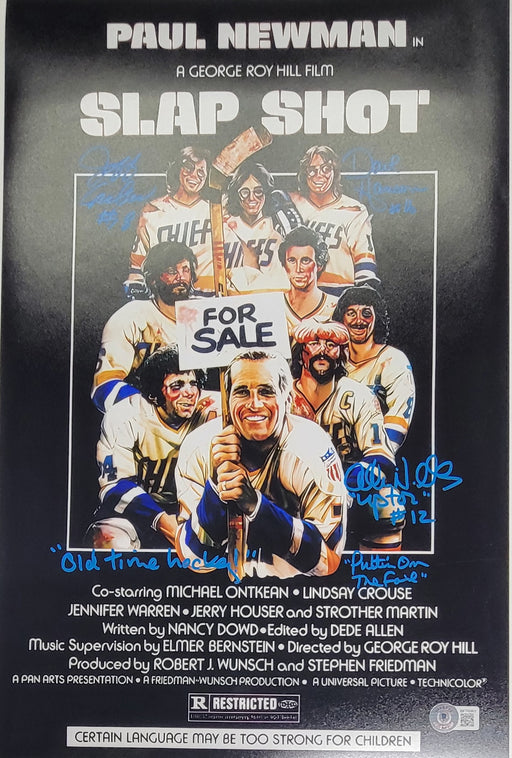 Slap Shot Cast Signed 11x17 Photo w/ 2 Inscriptions Signed by Dave Hanson, Jeff Carlson, & Allan Nichols All items come with a Beckett tamper-p...