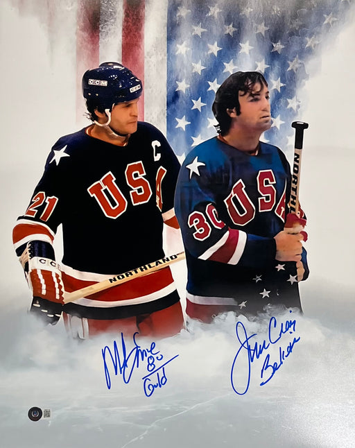 Mike Eruzione & Jim Craig Dual Signed 16x20 w/ Inscriptions '80 Gold & Believe' All items come with a Beckett tamper-proof hologram and a 1...